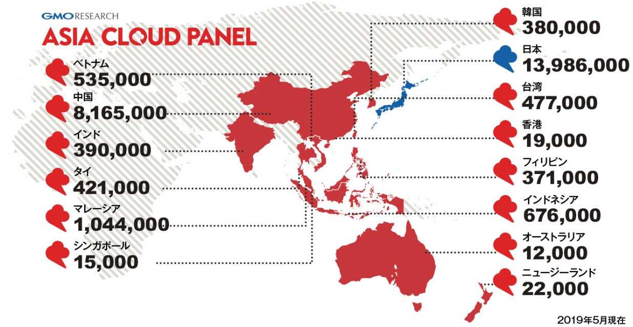 今回「ASIA Cloud Panel」は、オセアニア地域におけるインターネットリサーチ対象国の拡大と、消費者パネルの強化を目的に、ニュージーランドでポイントサイトを運営する企業と提携し、同社の持つ2万2,000人超の消費者パネルを新たに追加いたしました。