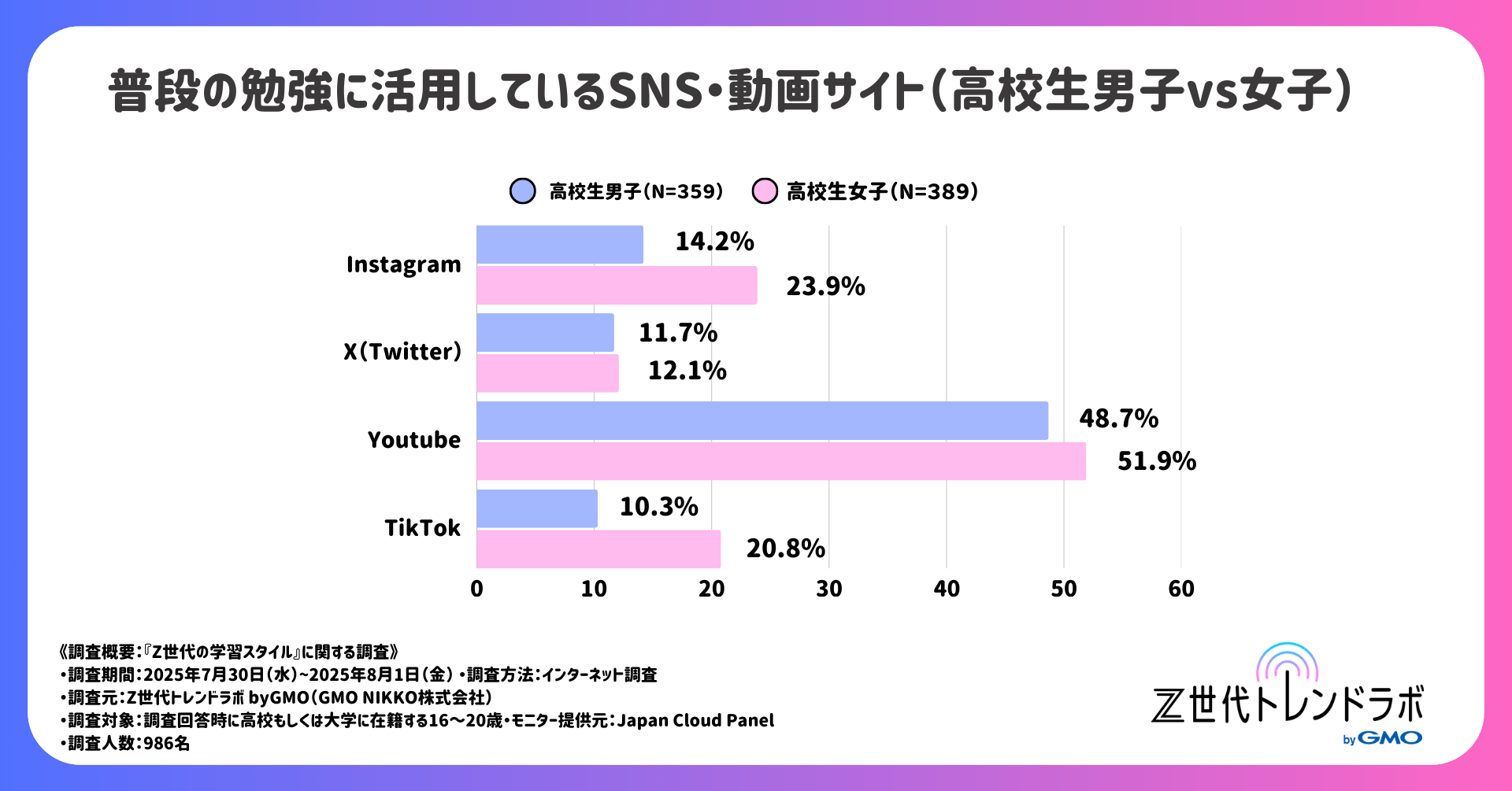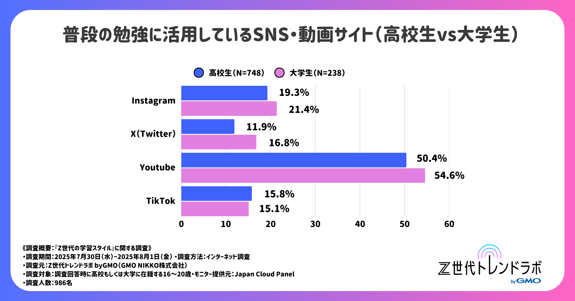 GMOインターネットグループのGMOインターネット株式会社の連結会社で、総合マーケティング支援事業を展開するGMO NIKKO株式会社(代表取締役社長執行役員:佐久間勇 以下、GMO NIKKO)が提供する「Z世代トレンドラボ byGMO」では、高校生・大学生986人を対象に、「Z世代の学習スタイルに関する自主調査」を実施しました。
