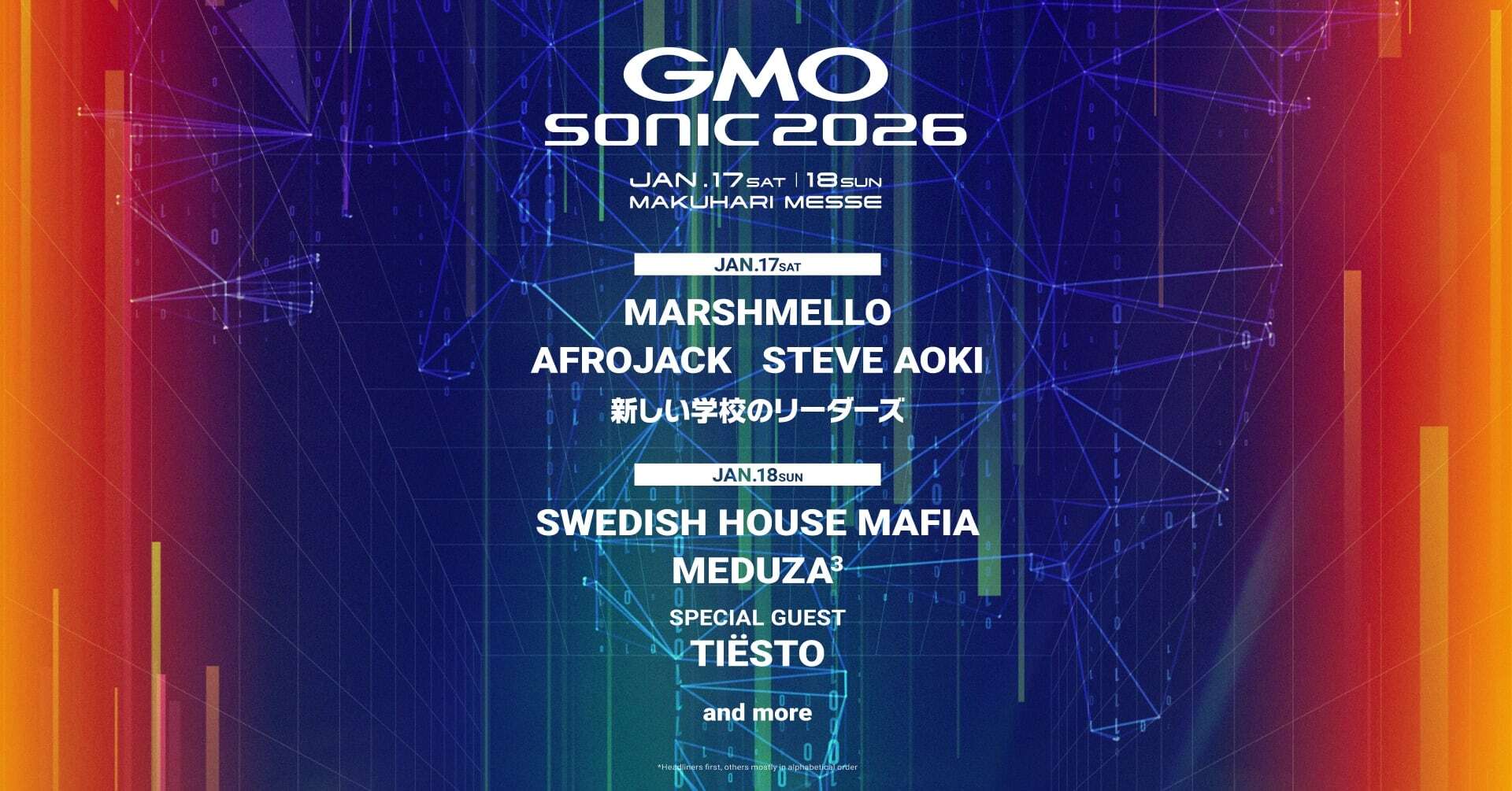 GMOインターネットグループ(グループ代表:熊谷 正寿)と、株式会社クリエイティブマンプロダクション(代表取締役:清水 直樹)は、2026年1月17日(土)・18日(日)の2日間、幕張メッセにて大型音楽フェスティバル「GMO SONIC 2026」を開催することを決定いたしました。