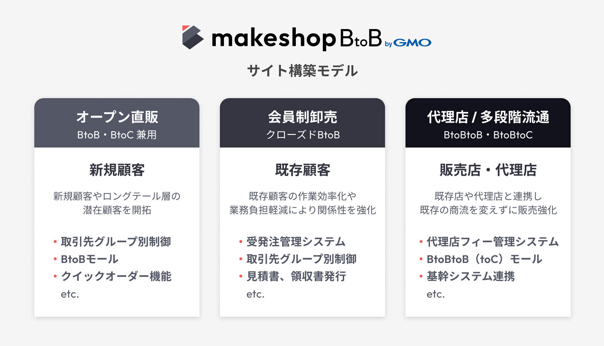 本サービスは、これまで「makeshop byGMO」で提供していたBtoB関連機能を統合・強化したソリューションです。「オープン直販」「会員制卸売」「代理店/多段階流通」といった多様なビジネススタイルに対応し、事業規模にあわせた柔軟な拡張性で、BtoB-ECにおける企業のDX戦略を強力にサポートします。