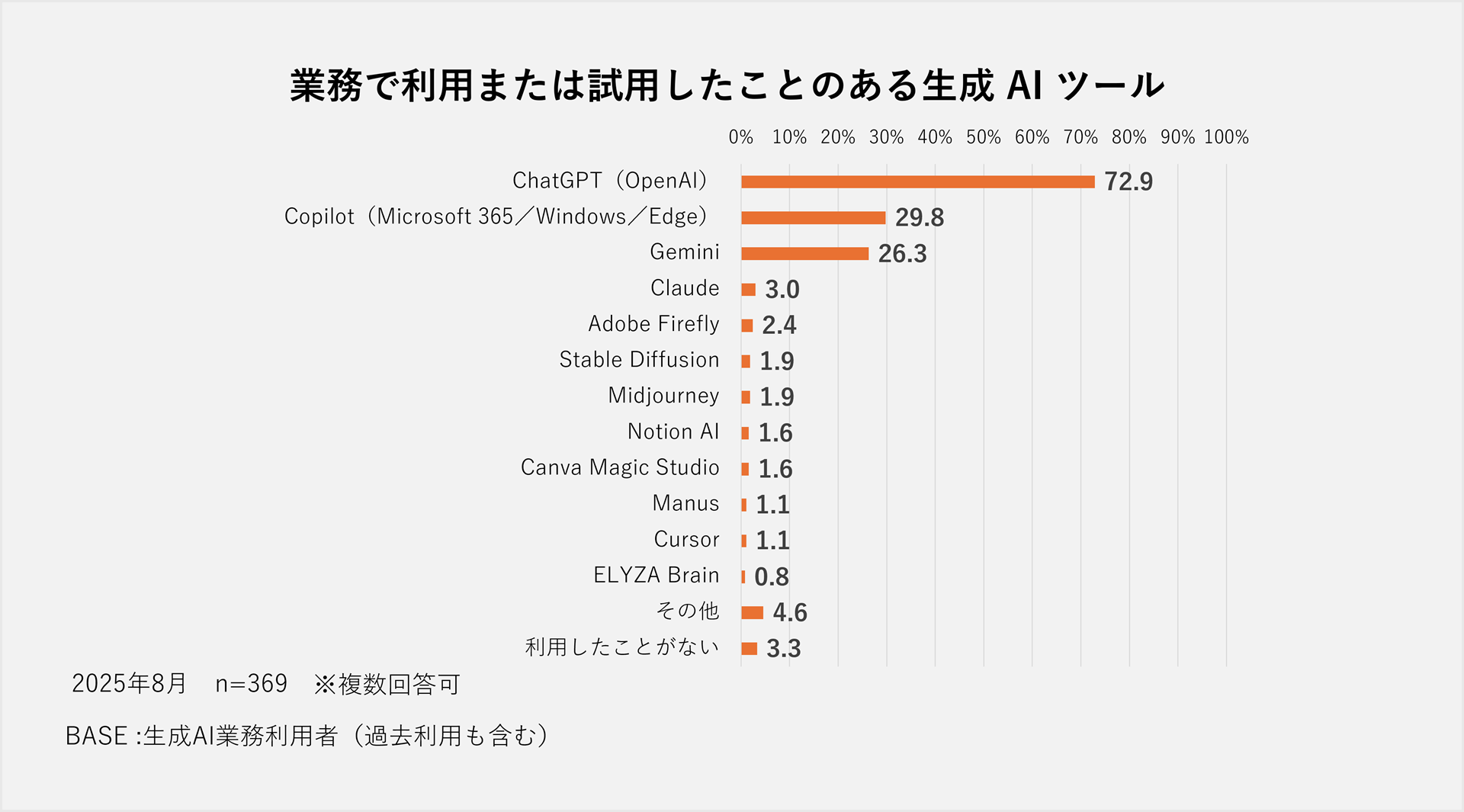 ・業務で利用または試用したことのある生成AIツールのトップは「ChatGPT(OpenAI)」72.9%
