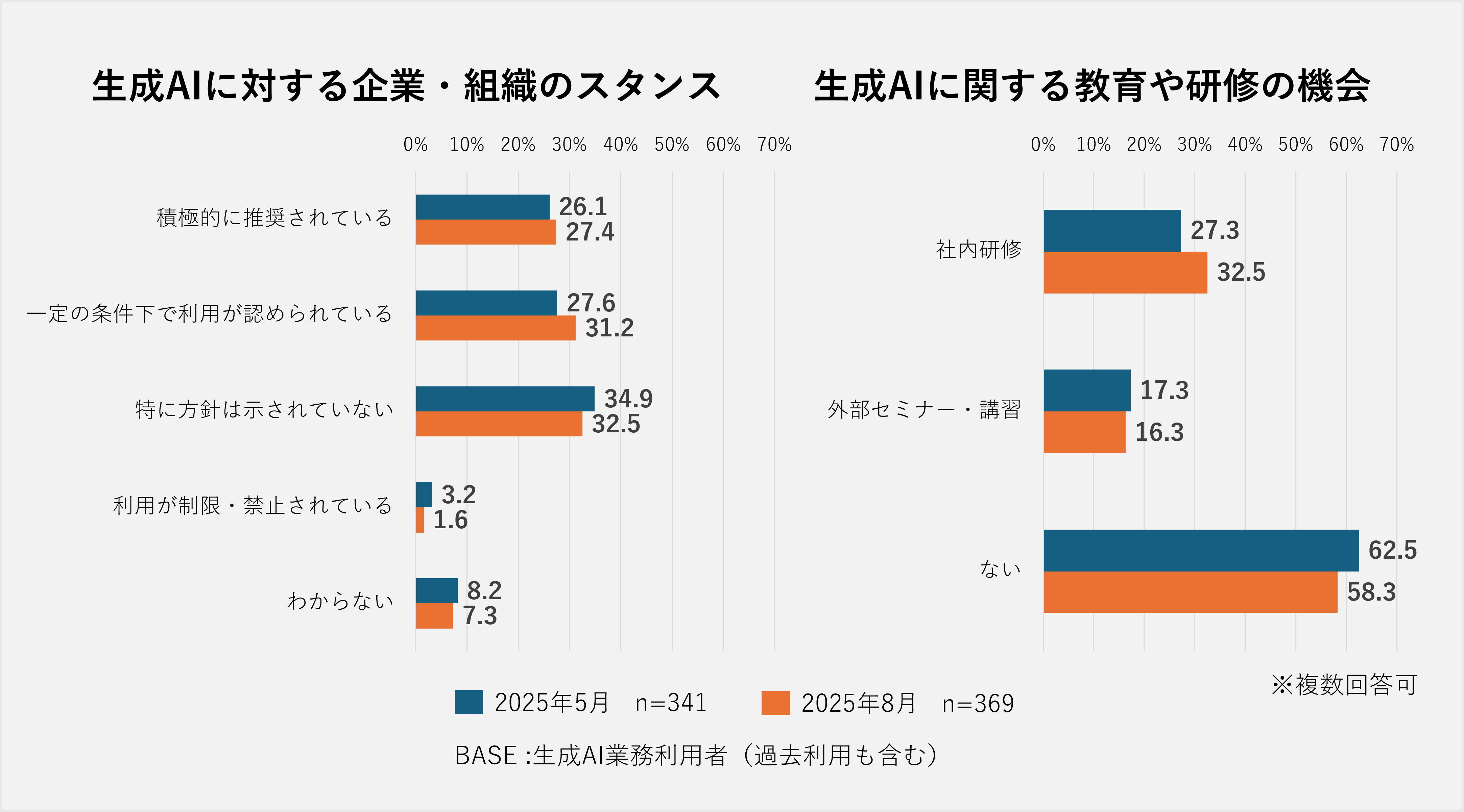■生成AIに対する企業・組織の方針、教育・研修機会(2025年5月~2025年8月)