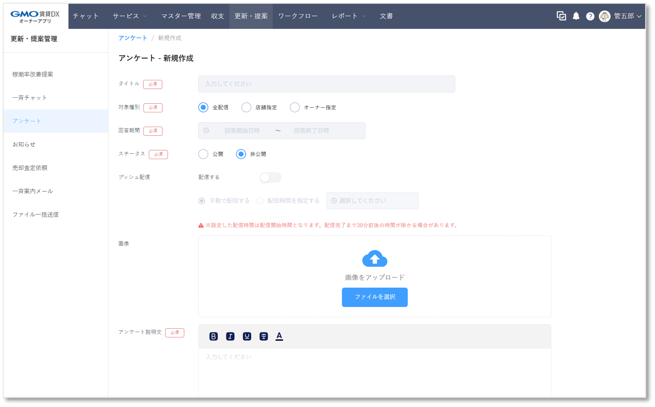 アンケートの設問は、不動産管理会社が自由に設定・変更可能です。オーナーの満足度や設備への要望、担当者への評価など、ニーズに応じた多様なテーマに対応できます。