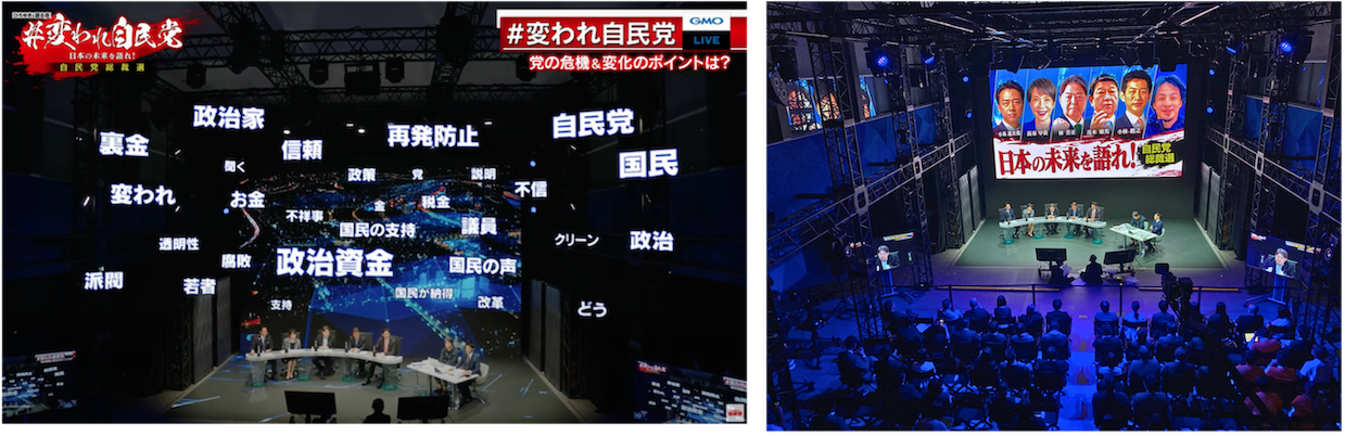 当日は、ひろゆき氏をモデレーターとして、自民党総裁候補の小林 鷹之氏、茂木 敏充氏、林 芳正氏、高市 早苗氏、小泉 進次郎氏が一堂に会しました。GMOグローバルスタジオが誇る約500インチの大型LEDを背に、各候補者の応援団が見守る中、およそ2時間にわたり、自身の政策を熱く語りあいました。配信ではGMOグローバルスタジオならではのXR技術も駆使し、当日のライブ視聴者数は両チャンネル合計で約5万人、再生回数は合計で120万回を突破しています。(2025年9月29日(月)14時00分時点)