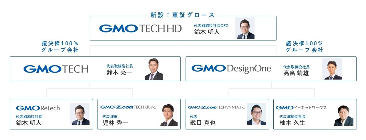 GMOインターネットグループでインターネット集客事業やインターネットメディア事業等を展開するGMO TECHホールディングス株式会社(代表取締役社長CEO:鈴木 明人 以下、GMO TECHホールディングス)は、GMO TECH株式会社(代表取締役社長:鈴木 亮一 以下、GMO TECH)とGMOデザインワン株式会社(代表取締役社長:高畠 靖雄 以下、GMOデザインワン)の共同株式移転により、本日2025年10月1日(水)に設立され、東京証券取引所グロース市場に上場いたしました。これに伴い、当社グループは企業価値の最大化を目的として、持株会社体制へと移行いたします。