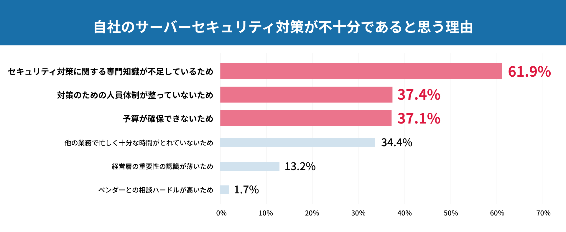 さらに、複数名の担当者を抱える企業でも、十分な時間をかけられているのは約1割にとどまっており、多くの企業でサーバーセキュリティへの投資が後回しにされている実態が浮き彫りとなりました。