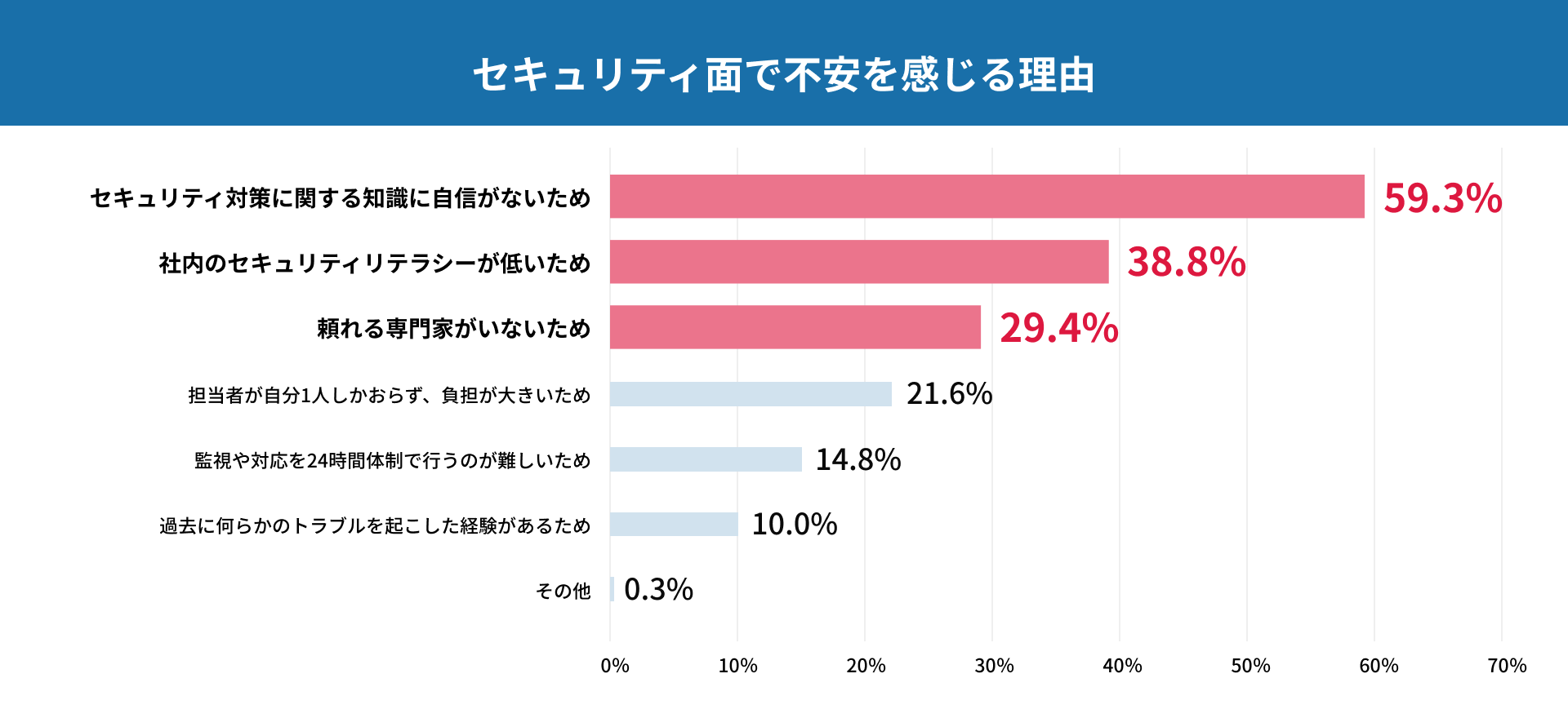 その理由として「セキュリティ対策に関する知識に自信がないため」「社内のセキュリティリテラシーが低いため」「頼れる専門家がいないため」が上位に挙げられています。個人のスキル不足だけでなく、企業全体としての支援体制が整っていないことが、中小企業における共通の課題であることが浮き彫りとなりました。