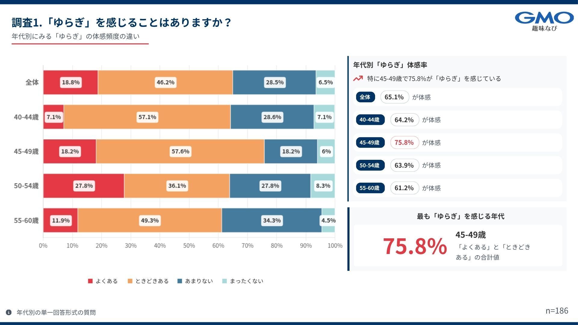 全体の 65.1% が「ときどきある」「よくある」と回答し、多くの女性が日常的に「ゆらぎ」を感じていることが分かりました。特に 45〜49歳では75.8% と高く、40代後半から50代前半にかけて意識されやすい傾向があります。