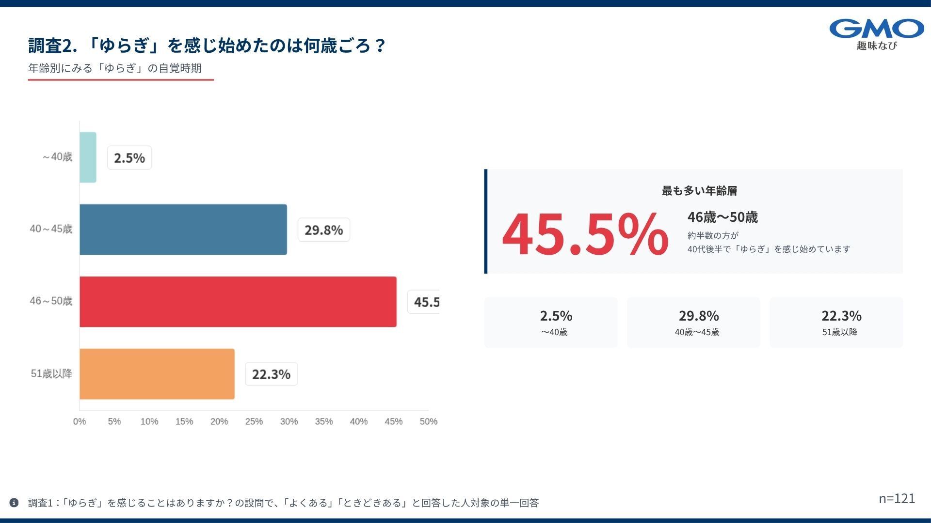 ・「ゆらぎ」を感じ始めた年齢は 46〜50歳が最多(45.5%)。
