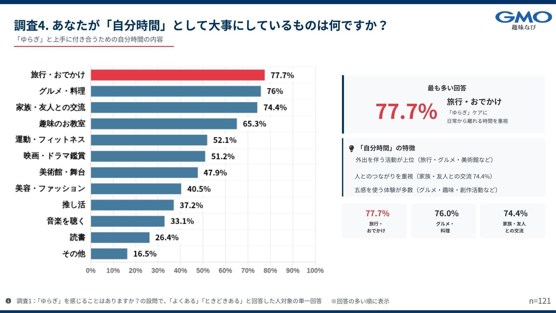 ・自分時間の過ごし方TOP3は「旅行・おでかけ」(77.7%)、「グルメ・料理」(76.0%)、「家族・友人との交流」(74.4%)。
