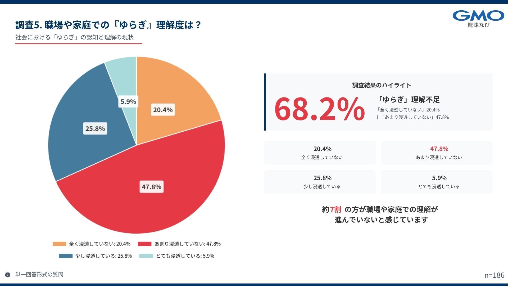 ・職場や家庭で「ゆらぎ」への理解が浸透していない人は 68.2%。