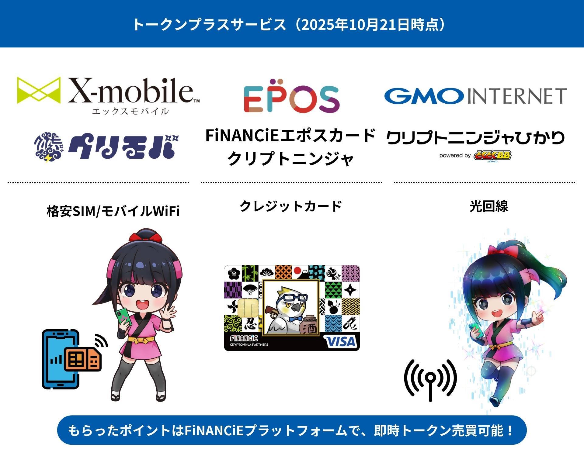ユーザーが本サービスに加入し、インターネットを利用することで、毎月の利用状況に応じて「限定FiNANCiEポイント」が付与されます。付与されたポイントは、「CryptoNinja」のコミュニティ「Ninja DAO Plus」の専用トークン「にんプラトークン」と交換できます。「にんプラトークン」は、「にんプラ(Ninja DAO Plus)」での活動を支援するためのデジタルアイテムで、FiNANCiEプラットフォーム上で売買・保有が可能です。保有者は、コミュニティに関連する限定特典やコンテンツへのアクセス権を得ることができ、ファンとしての参加体験を深めることができます。
