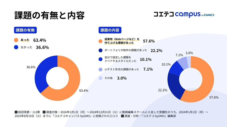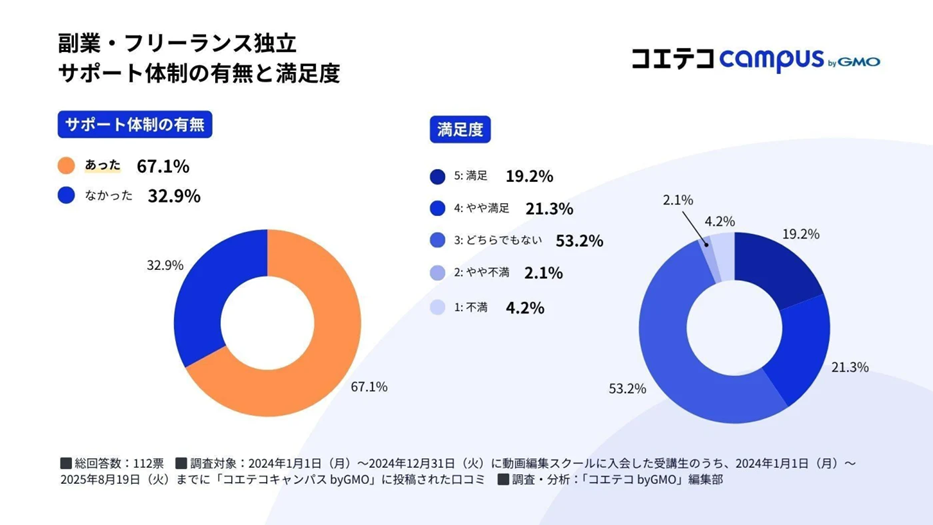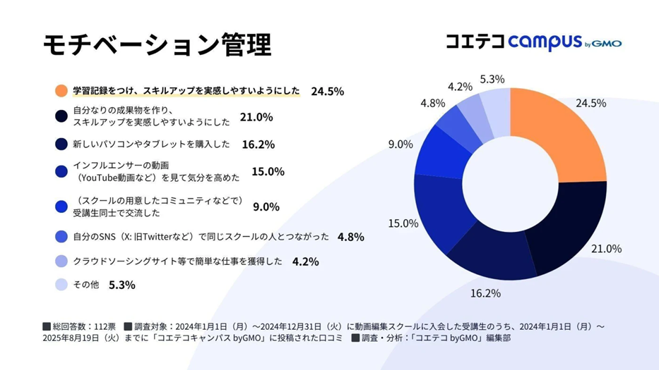 GMOインターネットグループのGMOメディア株式会社(代表取締役社長:森 輝幸 以下、GMOメディア)が運営するプログラミング・Webマーケティングスクール検索サイト「コエテコキャンパス byGMO」(URL:https://coeteco.jp/campus)は、2024年に動画編集スクールへ入会した受講者112名を対象に、2025年8月19日(火)までに「コエテコキャンパス byGMO」に投稿された口コミをもとに、満足度や学習環境に関する調査を実施しました。
