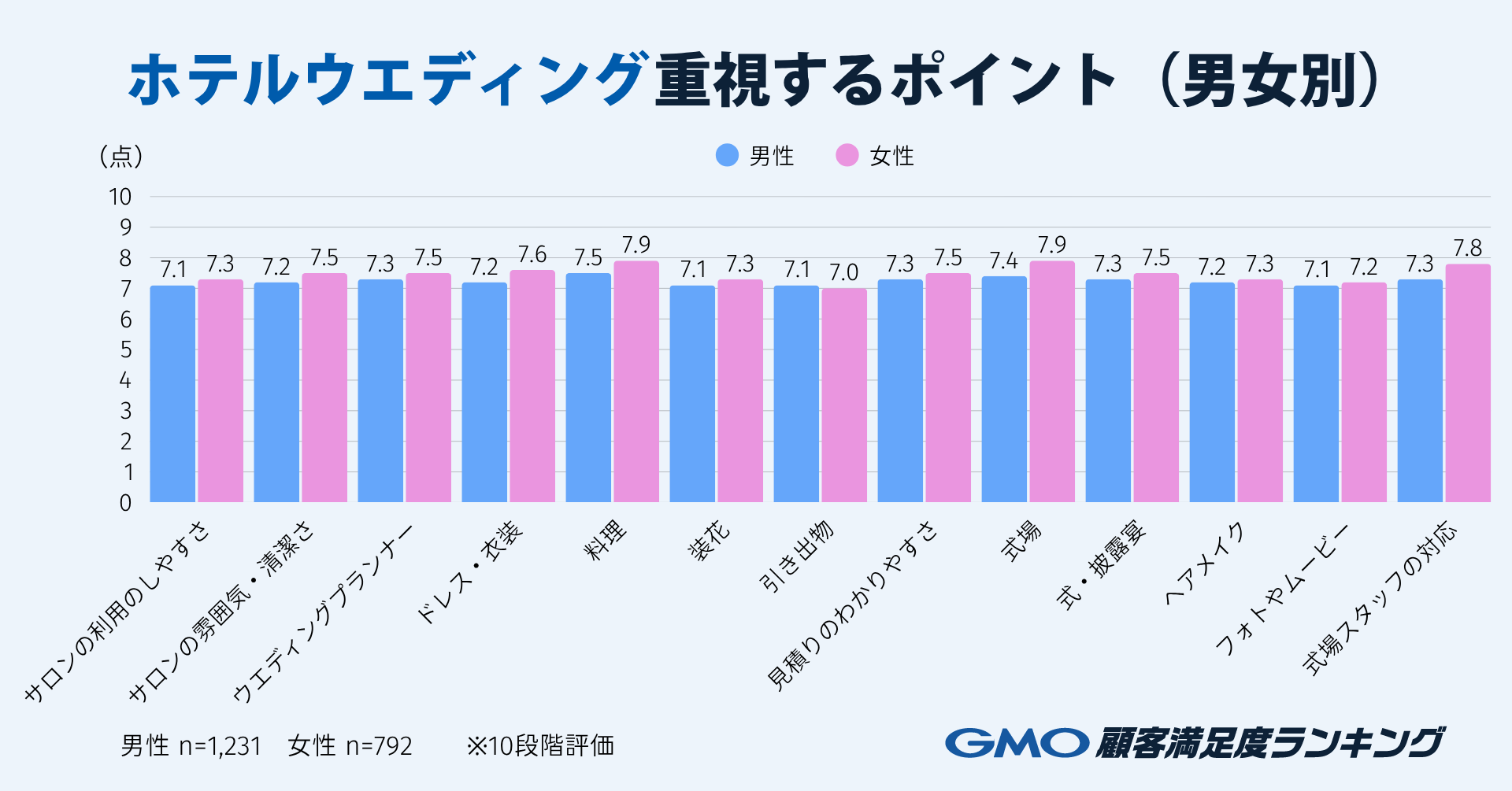「ホテルウエディング」の式場を選ぶ際に重視したポイントについて、各項目を10段階で評価する形式で調査しました。男女間、項目間で回答に大きな差異は見られませんでしたが、ほぼすべての項目で女性の方が男性よりも数値が高く示されており、ウエディングに対するこだわりがやや強い傾向が読み取れます。