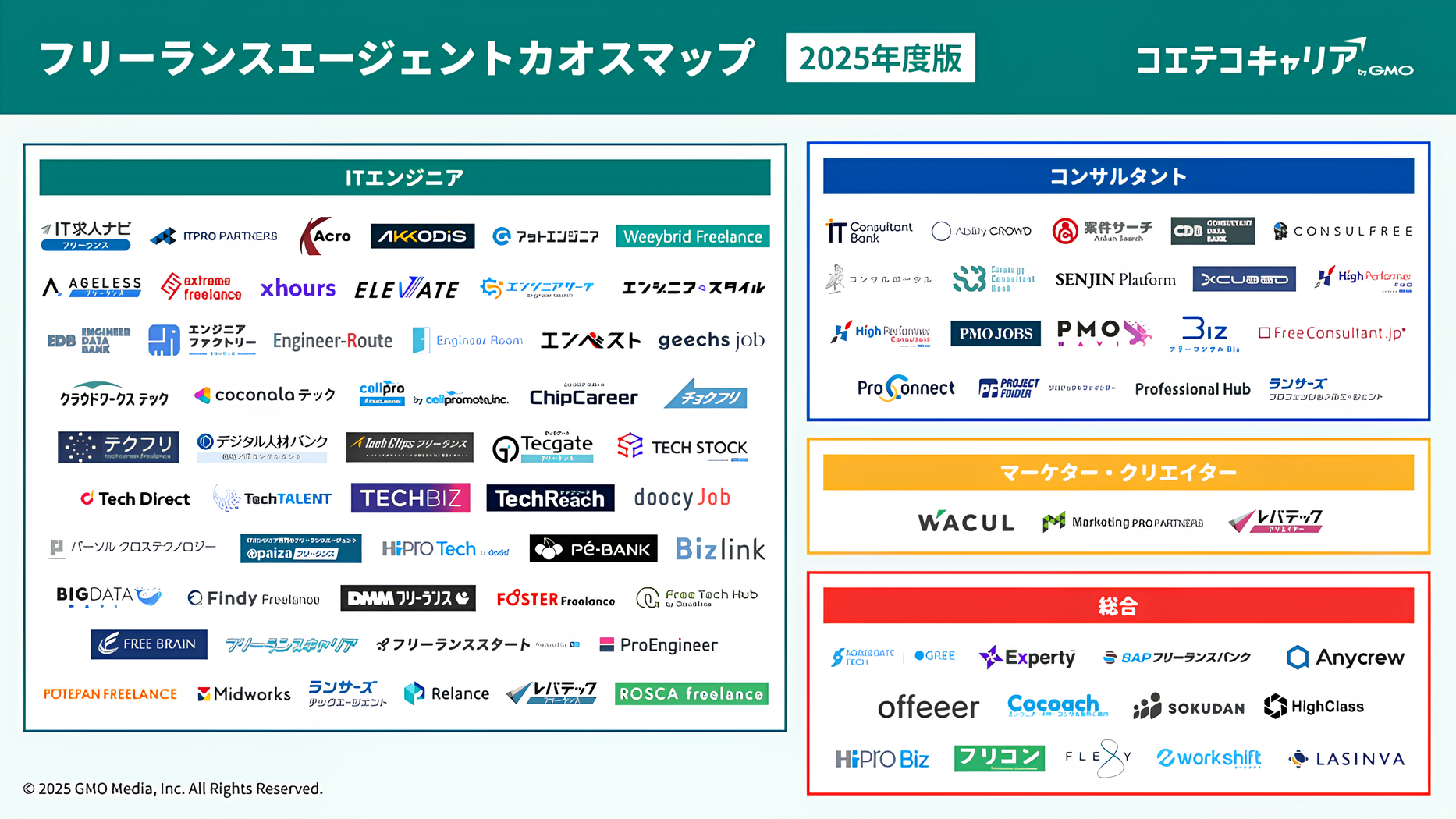 GMOインターネットグループのGMOメディア株式会社(代表取締役社長:森 輝幸 以下、GMOメディア)が運営するフリーランス・転職・副業サービス検索サイト「コエテコキャリア byGMO」(URL:https://coeteco.jp/career)は、2025年11月21日(金)に、フリーランスエージェント市場の最新動向を可視化した2025年版『フリーランスエージェントカオスマップ』を公開しました。