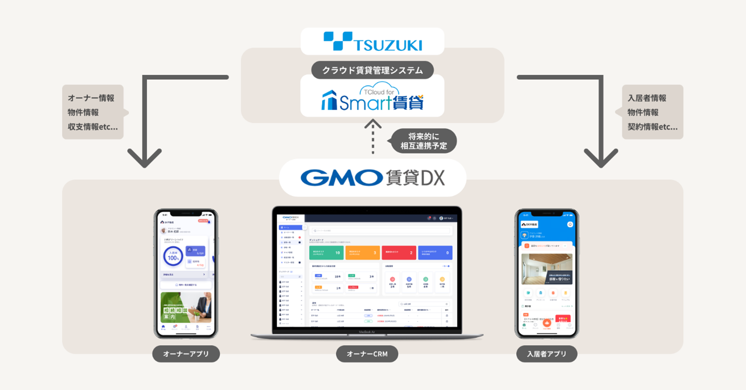 - 将来的には、「GMO賃貸DX」上の各種データを「TCloud for Smart賃貸」に自動連携する双方向連携を実現予定