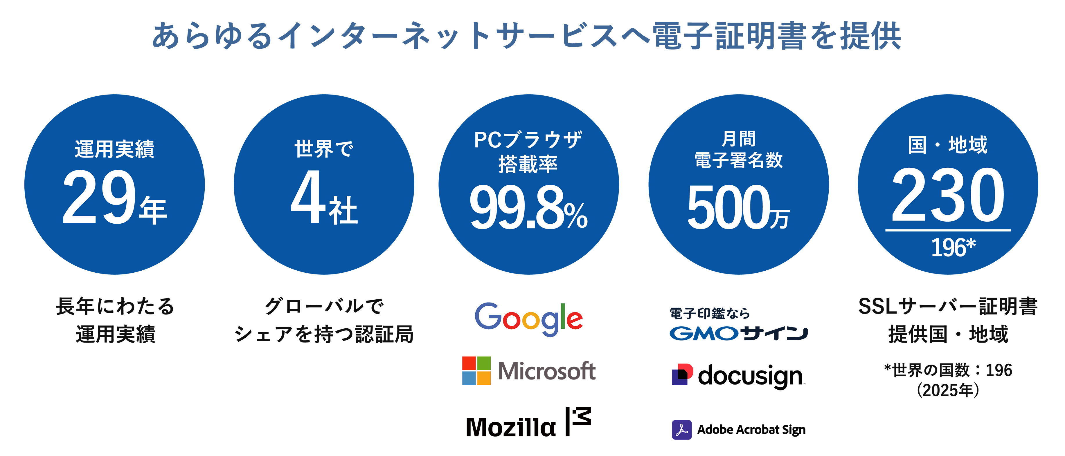 日本発の最上位認証局「GlobalSign」を運営し、世界11か国の拠点から各国の政府機関や企業に電子認証や電子署名の技術を提供しています。さらに、これらの技術を活用した国内シェアNo.1(※4)電子契約サービス「電子印鑑GMOサイン」を企業や自治体に提供し、安全な社会インフラを支えています。