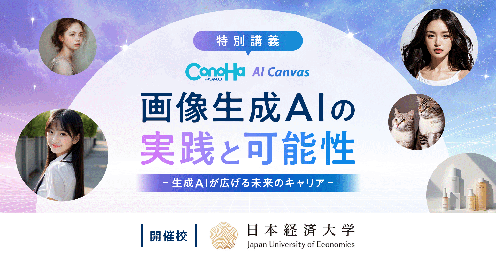 講義では、ブラウザ上で簡単に高品質なAI画像を生成できる「ConoHa AI Canvas」(URL:https://www.conoha.jp/ai/canvas/)のハンズオンやデモなどを行い、演習を通じて実践的なスキル取得をめざし、画像生成AIの実務導入を見据えた教育を提供します(※2)。