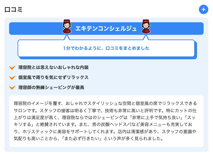 膨大な口コミをAIが要約し、1分間程度と短い時間で読める文章量で提示。ユーザーは店舗の評判を一目で確認することができます。