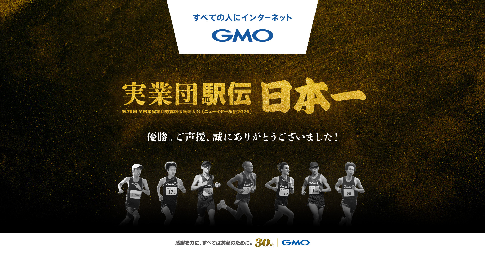 おかげさまをもちまして、GMOインターネットグループ陸上部は、創部10年、ニューイヤー駅伝は7回目の挑戦で初めての優勝を飾ることができました。今後も更なる高みを目指し、精進してまいります。引き続き、皆様のご声援を賜りますよう、よろしくお願い申し上げます。
