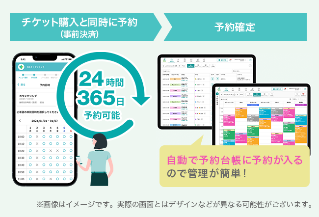 ユーザーはチケット購入と同時に予約日時を確定できるため、事前決済の安心感を保ちつつ、スムーズでストレスのない購入・予約体験が可能になることで購入意欲の向上が期待されます。クリニック側においても、即時予約への対応により機会損失を防ぎ、チケット購入件数の増加が見込まれるほか、予約調整や入力作業の負担軽減により、スタッフの工数削減や予約トラブル防止といった運営上のメリットも得られます。