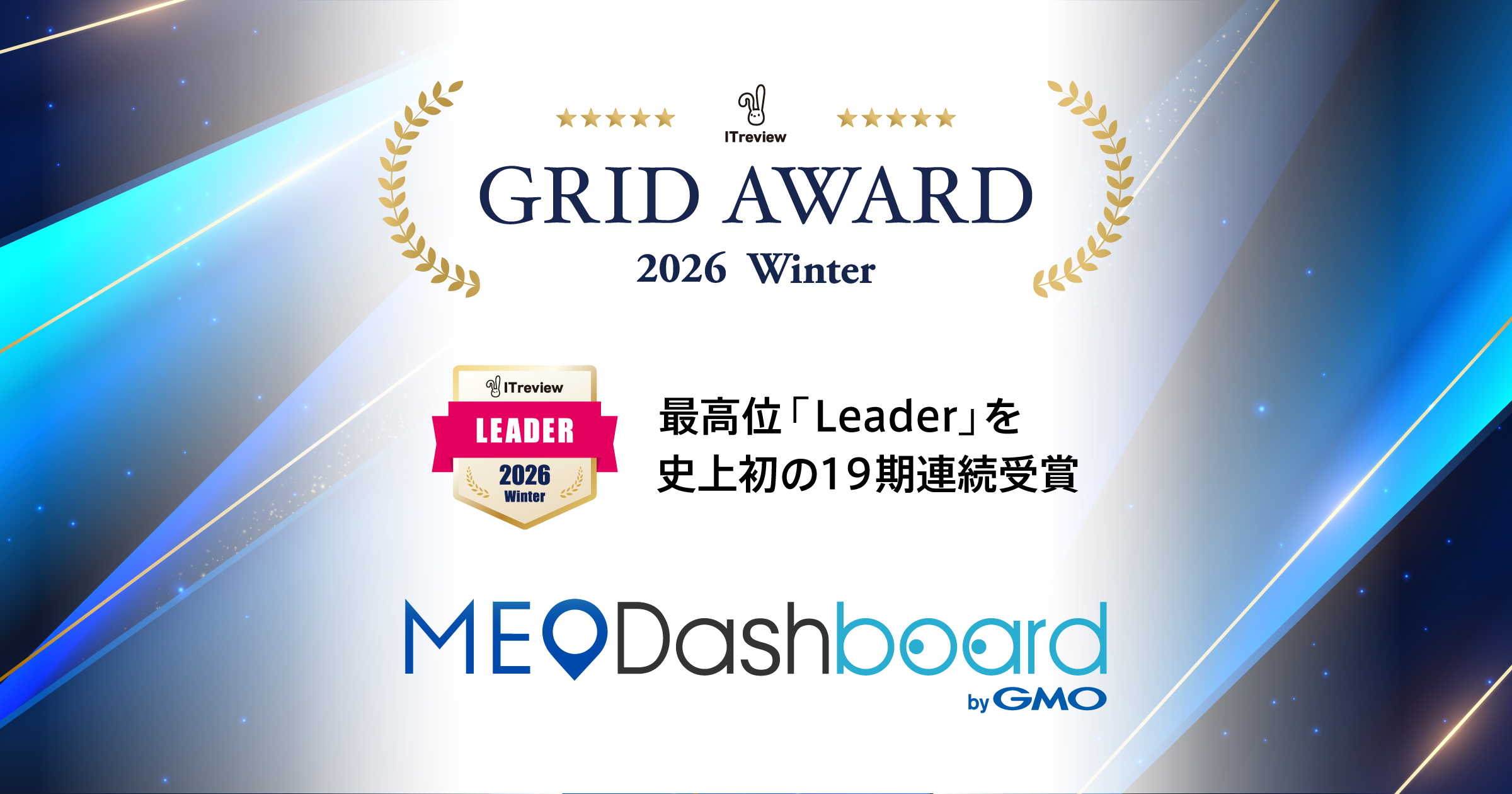 GMOインターネットグループのGMO TECH株式会社(代表取締役社長:鈴木 亮一 以下、GMO TECH)が提供するMEO(※)総合管理ツール『MEO Dashboard byGMO』は、「ITreview Grid Award 2026 Winter」(主催:アイティクラウド株式会社 URL:https://www.itreview.jp/award/2026_winter.html)にて、MEO部門・SNS管理部門の最高位「Leader」賞を受賞いたしました。