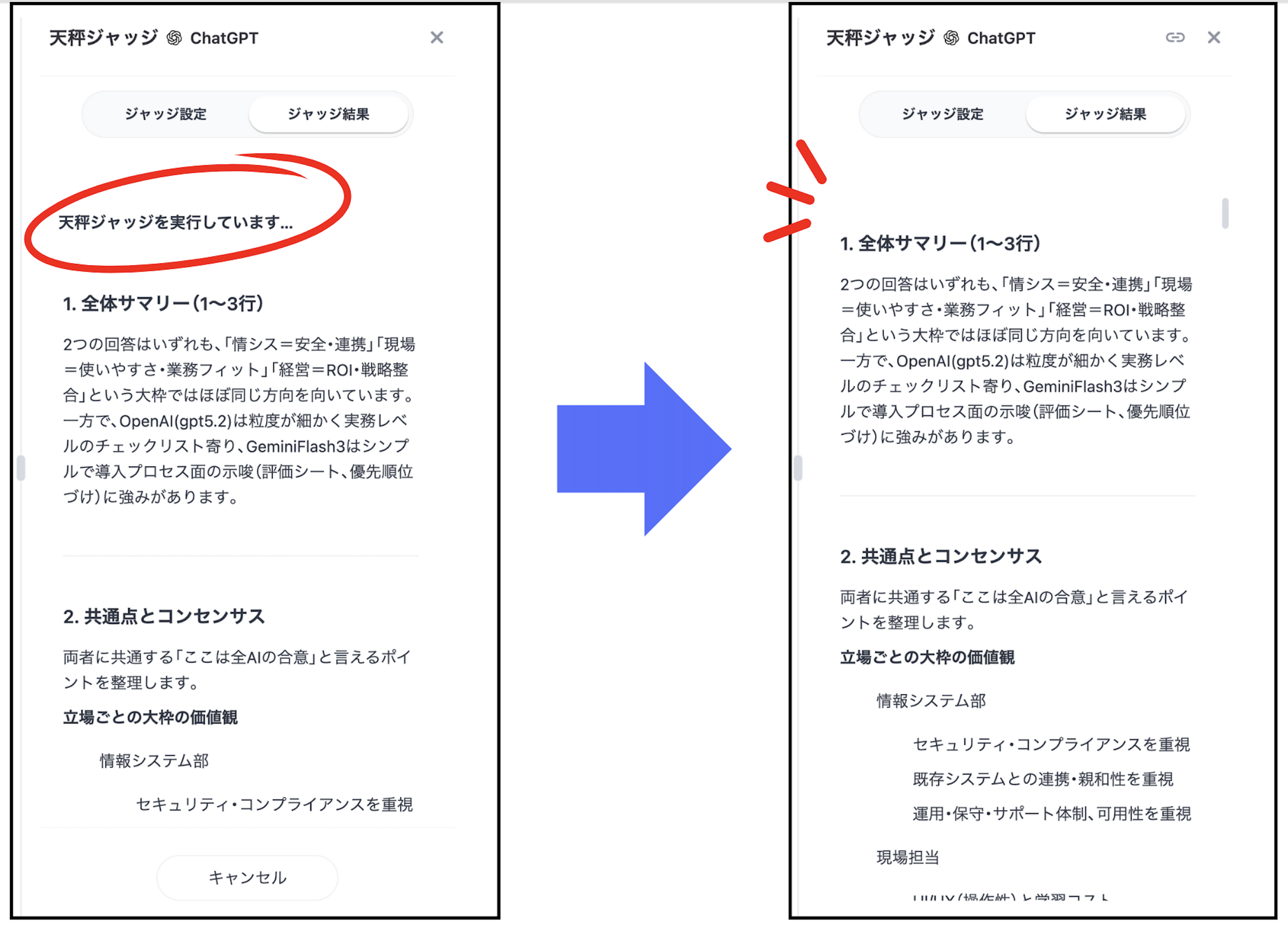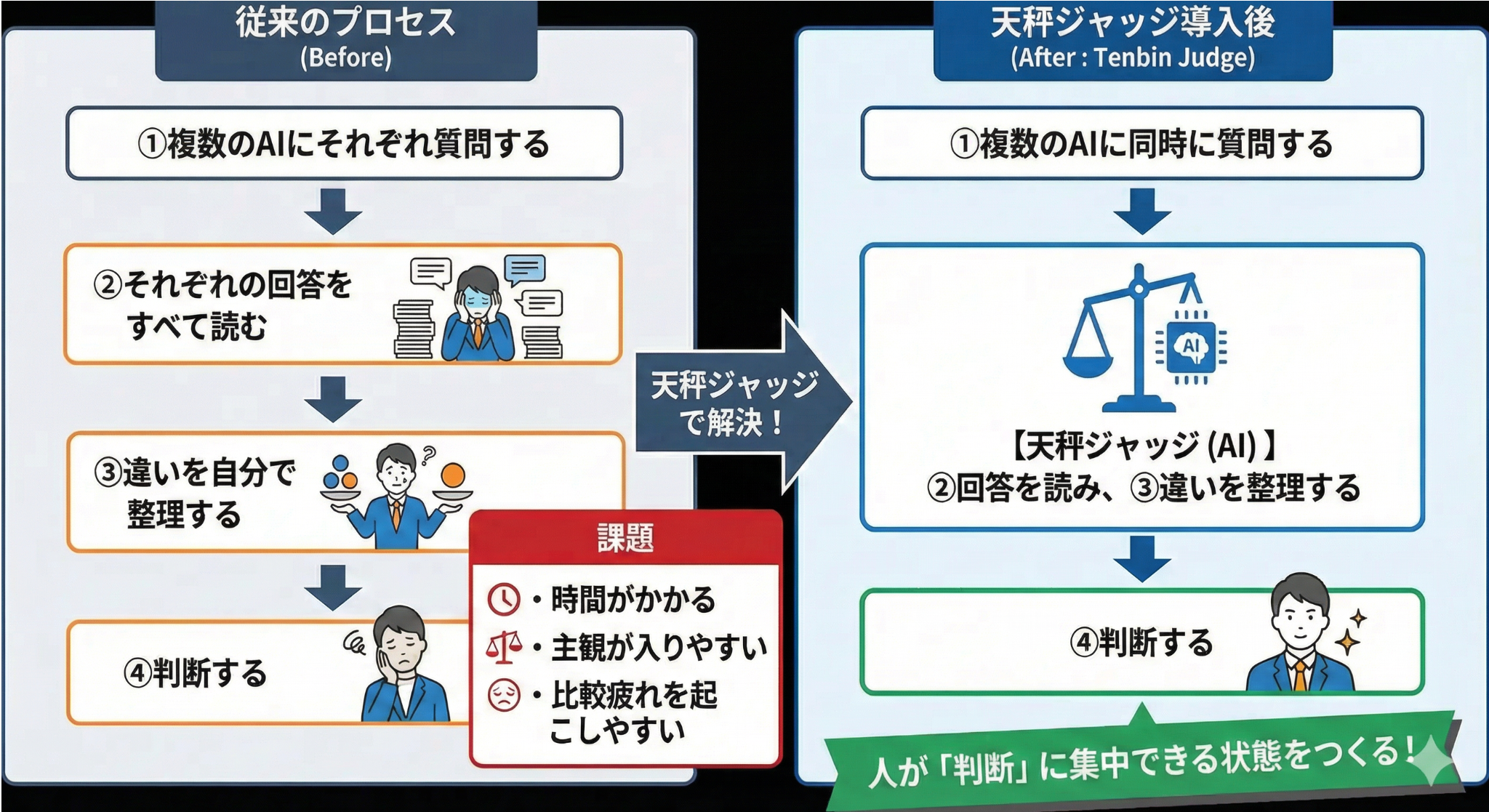 このたび提供を開始した「天秤ジャッジ」は、複数のAIモデルが生成した回答を AIが自動で読み解き、比較・評価する機能です。従来の回答比較では人間が長文を読み比べる必要がありましたが、「天秤ジャッジ」では各モデルの共通点、相違点、独自の視点を構造的に整理し、さらに 実用性や論理性の観点から回答の評価・推薦を行います。これにより、ユーザーは 膨大な候補の中から迅速に最適な回答を見つけることが可能 になります。