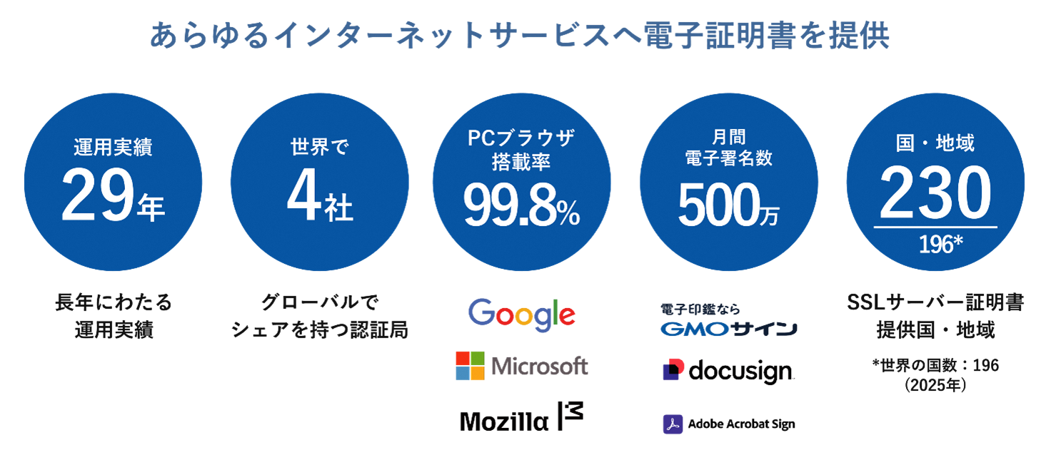 日本発の最上位認証局「GlobalSign」を運営し、世界11か国の拠点から各国の政府機関や企業に電子認証や電子署名の技術を提供しています。さらに、これらの技術を活用した国内シェアNo.1(※5)電子契約サービス「電子印鑑GMOサイン」を企業や自治体に提供し、安全な社会インフラを支えています。