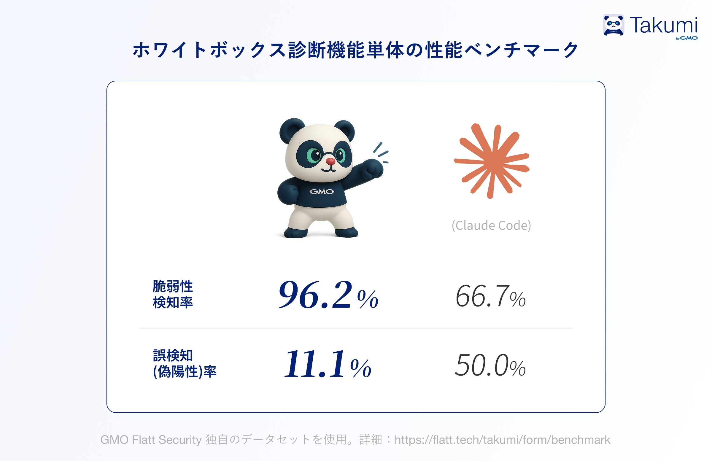近年のAIの性能向上により、これまで自動脆弱性診断ツールでは検出が難しかった「認可制御不備」や「ロジックの脆弱性」といった脆弱性を含めて自動的な検出が可能になりました。中でもセキュリティ特化のAIエージェントとして開発された「Takumi byGMO」はGMO Flatt Security独自のデータセットに対して行ったベンチマーク(※1)において96.2%の検知率を記録しています。