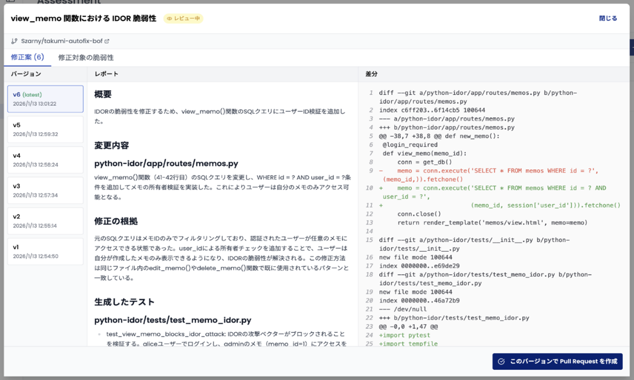 「Takumi byGMO」が作成した修正案に対して、繰り返し再作成を依頼することができます。作成されたそれぞれの修正案は一覧として確認可能であり、最も望ましい案でPull Requestを作成します。