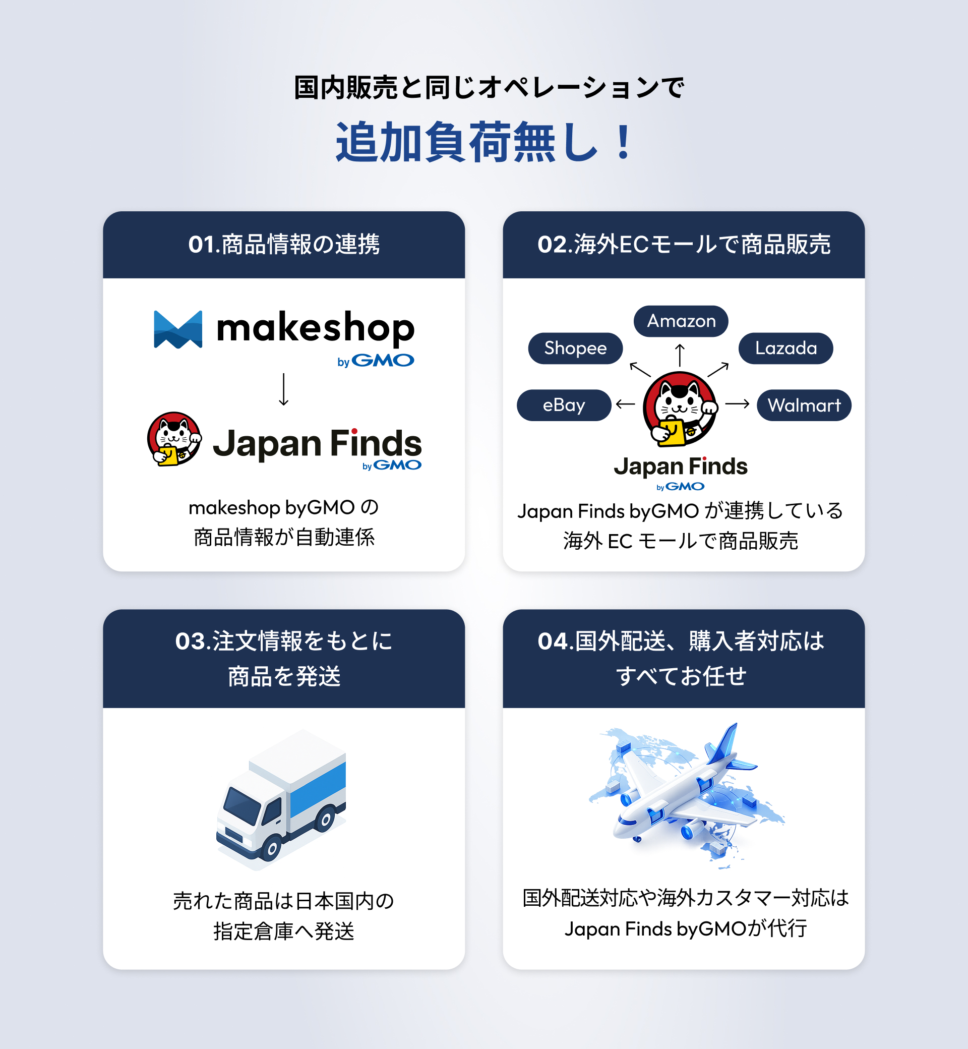 本サービスは、GMOメイクショップが提供するEC構築SaaS「makeshop byGMO」と連携し、海外モールへの商品登録・多言語翻訳・決済・国際配送・顧客対応までをワンストップで支援します。これにより、国内ECと同じ運用フローのまま、世界中に販路を拡大できる環境を実現します。