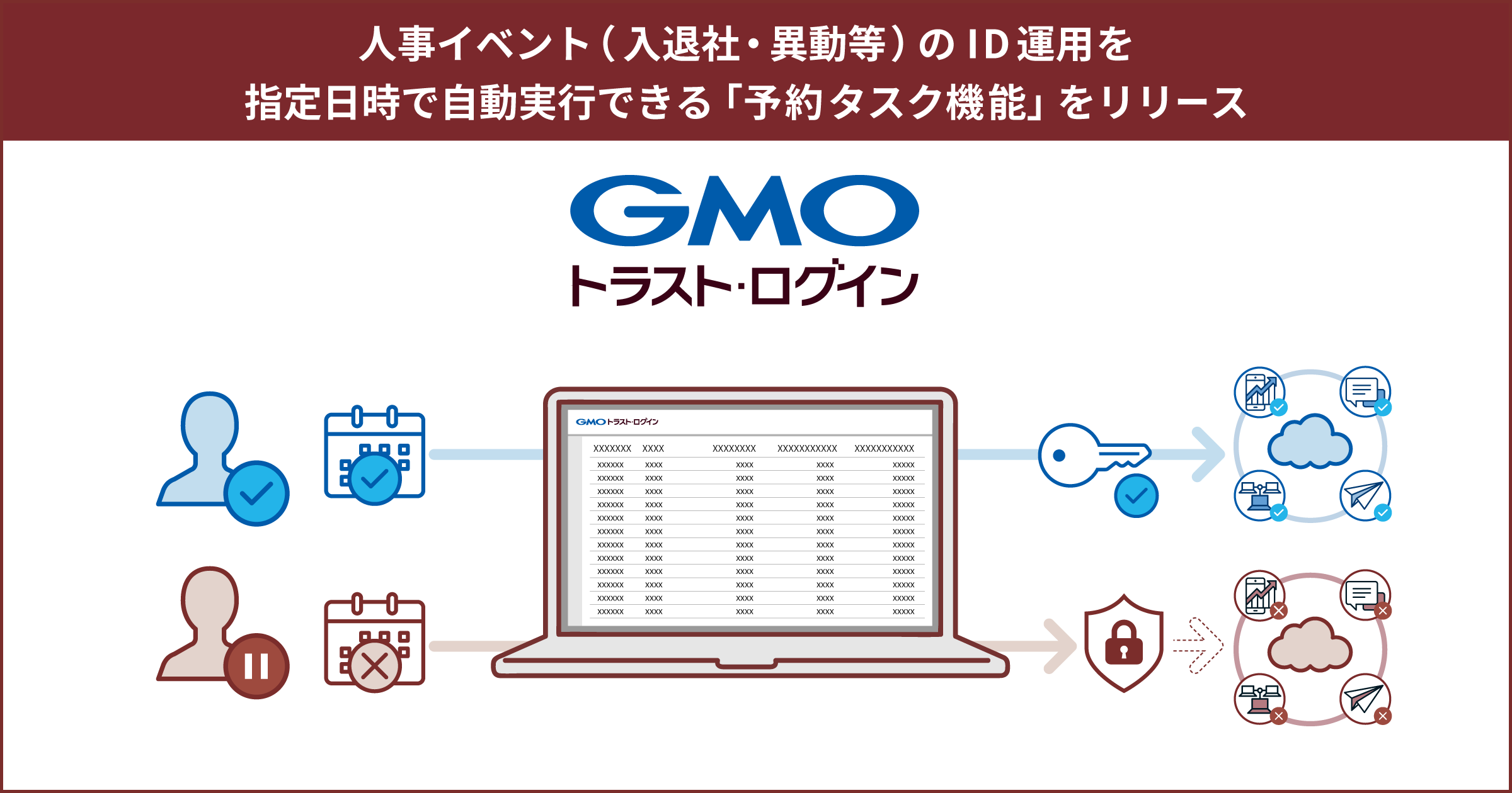 GMOインターネットグループのGMOグローバルサイン株式会社(※1)(代表取締役社長:中條 一郎 以下、GMOグローバルサイン)が提供するID管理・認証サービス「GMOトラスト・ログイン」は、2026年2月19日(木)より、人事イベントなどでのID運用を指定日時で自動実行できる「予約タスク機能」をリリースいたしました。