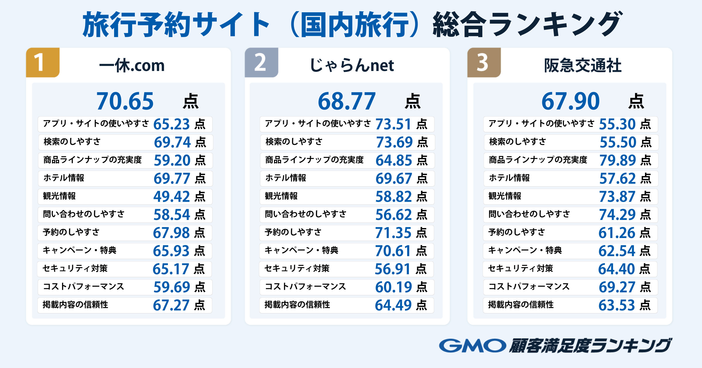 GMOインターネットグループのGMOリサーチ&AI株式会社(代表取締役:荻田 剛大)は、同社が運営する「GMO顧客満足度ランキング」における「旅行予約サイト(国内旅行)」(※1)カテゴリのランキング結果を2026年2月25日(水)に公開しました。各サービス利用者が本当に満足している国内旅行の旅行予約サイトを明らかにする、同カテゴリの総合ランキングでは、一休.comが1位に輝きました。