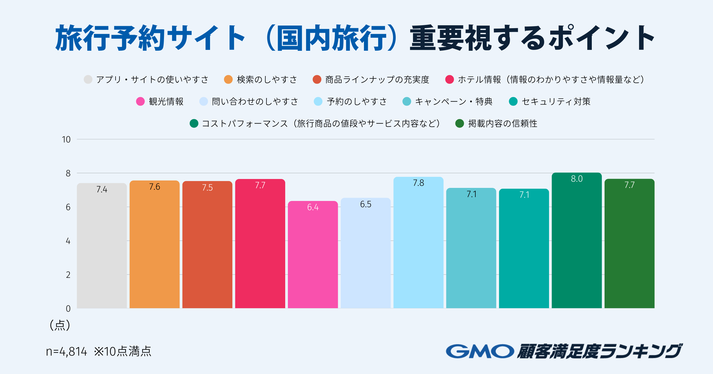 国内旅行予約サイト選びにおいて、利用者が最も重要視しているのは「コストパフォーマンス(旅行商品の値段やサービス内容など)」(平均8.0点)でした。次いで「予約のしやすさ」(7.8点)、「掲載内容の信頼性」(7.7点)が続きます。
