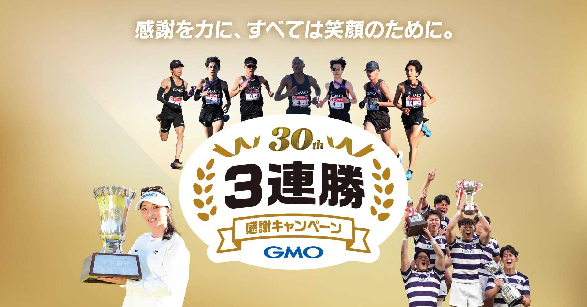 GMOインターネットグループ株式会社(代表取締役グループ代表:熊谷正寿)は、インターネット事業開始30周年の節目と、GMOインターネットグループ陸上部、所属プロゴルファー 脇元華選手、オフィシャルスポンサーの明治大学ラグビー部によるスポーツ3連勝への感謝を込めて、「30周年 3連勝・感謝キャンペーン」を本日2026年3月3日(火)より開始することをお知らせいたします。