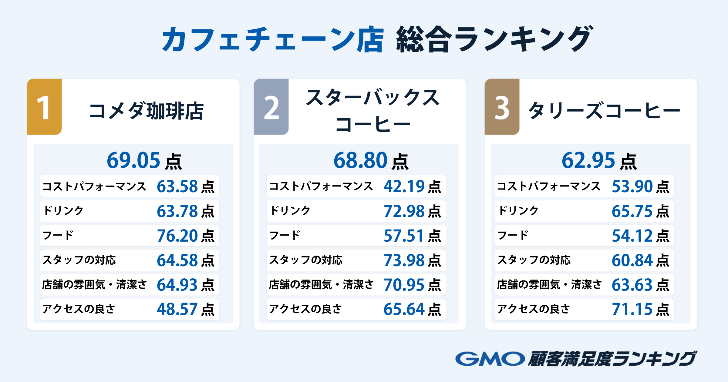 GMOインターネットグループのGMOリサーチ&AI株式会社(代表取締役社長:荻田 剛大)は、同社が運営する「GMO顧客満足度ランキング」における「カフェチェーン店」(※1)カテゴリのランキング結果を2026年3月18日(水)に公開しました。各サービス利用者が本当に満足しているカフェチェーン店を明らかにする、同カテゴリの総合ランキングでは、コメダ珈琲店が1位に輝きました。