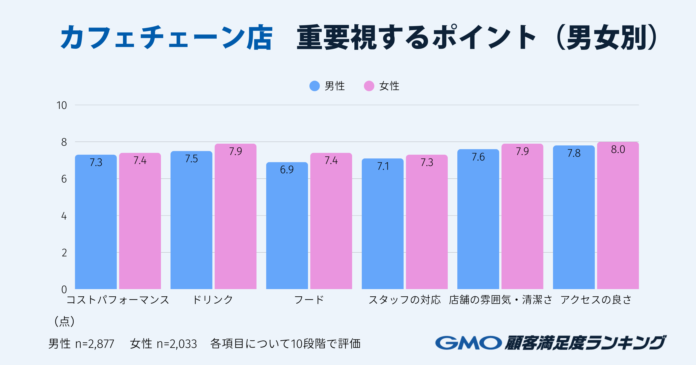男女別に見ると、全体的に女性の方が各項目をより重視する傾向が見られました。特に「ドリンク(メニューの充実度や味など)」は女性が7.9点(男性7.5点)、「フード(メニューの充実度や味など)」も女性7.4点に対し、男性6.9点と差が見られます。一方、「コストパフォーマンス」は、男性が7.3点、女性が7.4点と、重視度合いはほぼ同等でした。
