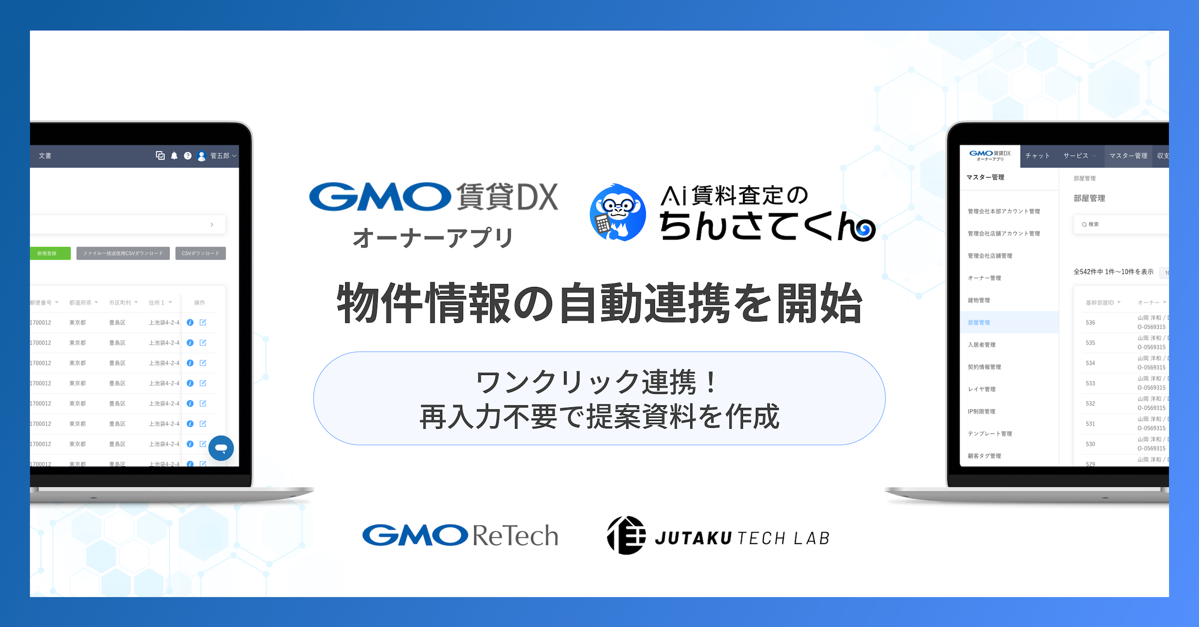 こうした状況を背景に、GMO ReTechは「GMO賃貸DX」を通じて不動産管理会社の業務支援を行い、住宅テックラボはAI賃料査定システム「ちんさてくん」によって市場動向と相場を反映した査定を提供することで、不動産管理会社の業務効率化に寄与してきました。