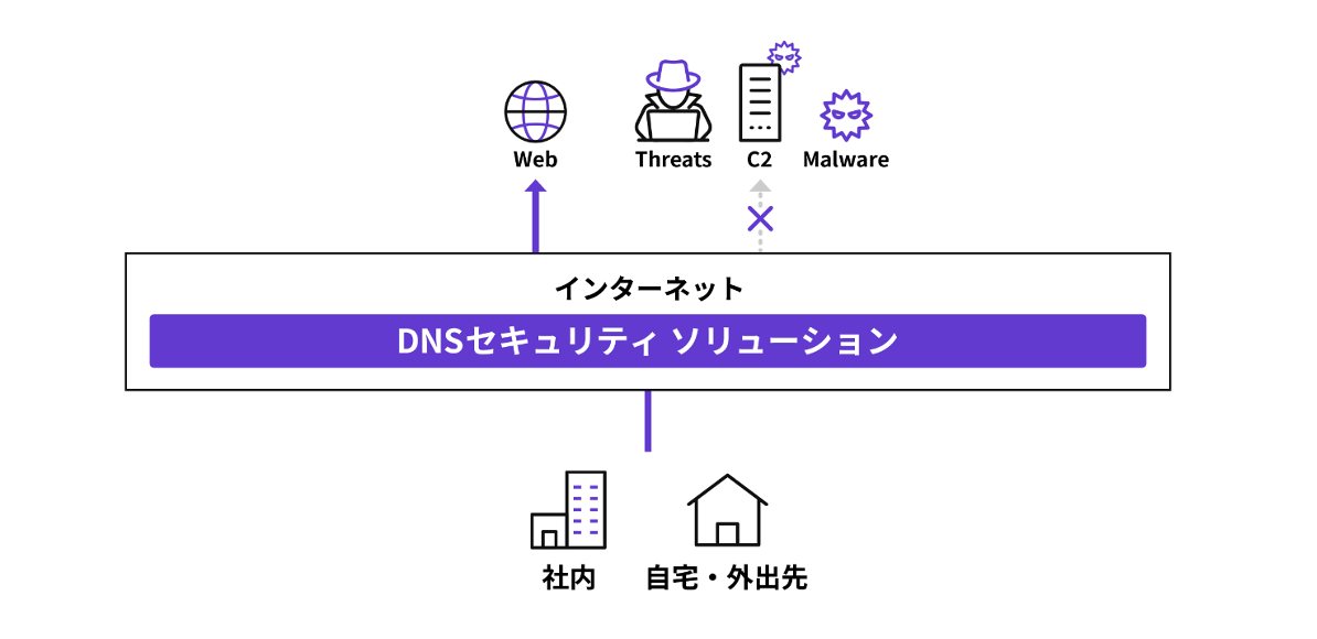 万が一、端末がマルウェアに感染した場合でも、攻撃者が遠隔操作を行うための外部サーバーとの通信をDNSで遮断し、情報の持ち出しや社内ネットワークへの被害拡大を防ぎます。