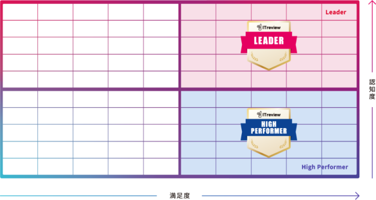 「ITreview Grid」で満足度が高い領域のプロダクトには「High Performer」バッジが発行され、満足度・認知度両方の領域で高い評価を得たプロダクトには「Leader」バッジが発行されます。