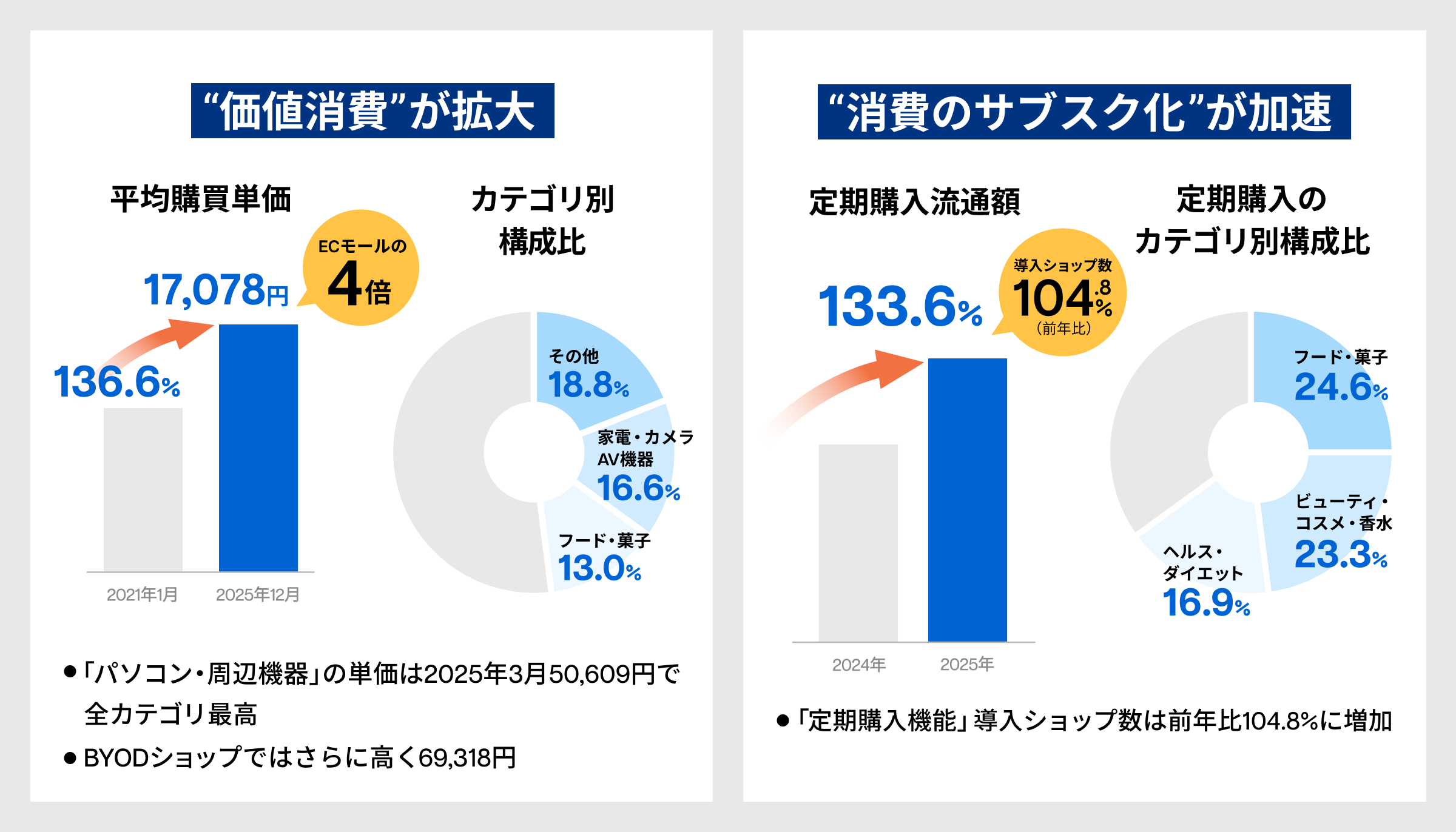 また、「makeshop byGMO」に蓄積された購買データの分析から、自社ECにおける消費行動の傾向が読み取れました。自社ECの平均購買単価はECモールの4倍以上に達し、定期購入による流通額は前年比133.6%と大きく伸長。物価上昇下においても、価格より付加価値を重視する”価値消費”や、定期購入により継続的に利用する“消費のサブスク化”が進行していることが明らかになりました。