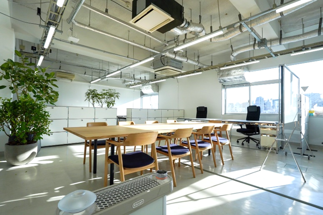 ・ 随所に設置した観葉植物のグリーンや、木のセンターテーブルによりリラックスできる空間を実現。アイディアの発想を促進。