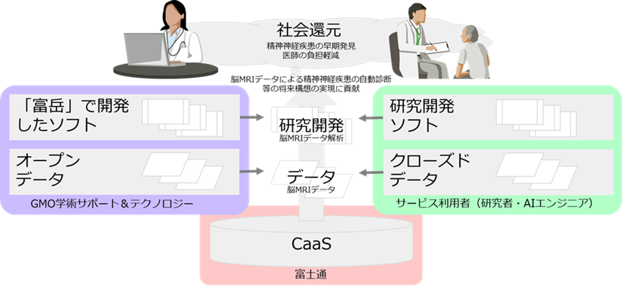 GMO学術サポート&テクノロジーは今後、脳MRIデータ解析やAI自動診断をはじめとする各種アプリの開発者や研究者に向けた利用環境を構築します。富士通は、このような取り組みに対し「CaaS」の提供を通じて、医療分野に留まらずさまざまな産業や防災などの幅広い分野における「富岳」をはじめとするスーパーコンピュータを活用した研究開発成果の実用化を加速し、社会課題解決に貢献していきます。