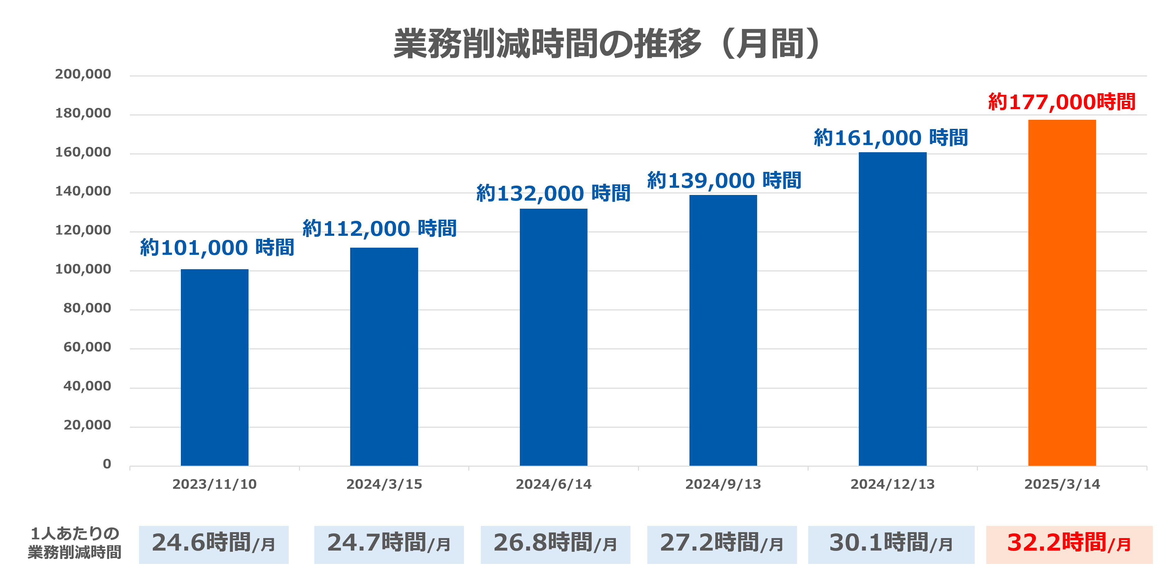 ・生成AIの活用で、ひと月あたり約17.7万時間(前回調査差+約1.6万時間)の削減、1人あたり約32.2時間(前回調査差+約2.1時間)の削減を実現しました。