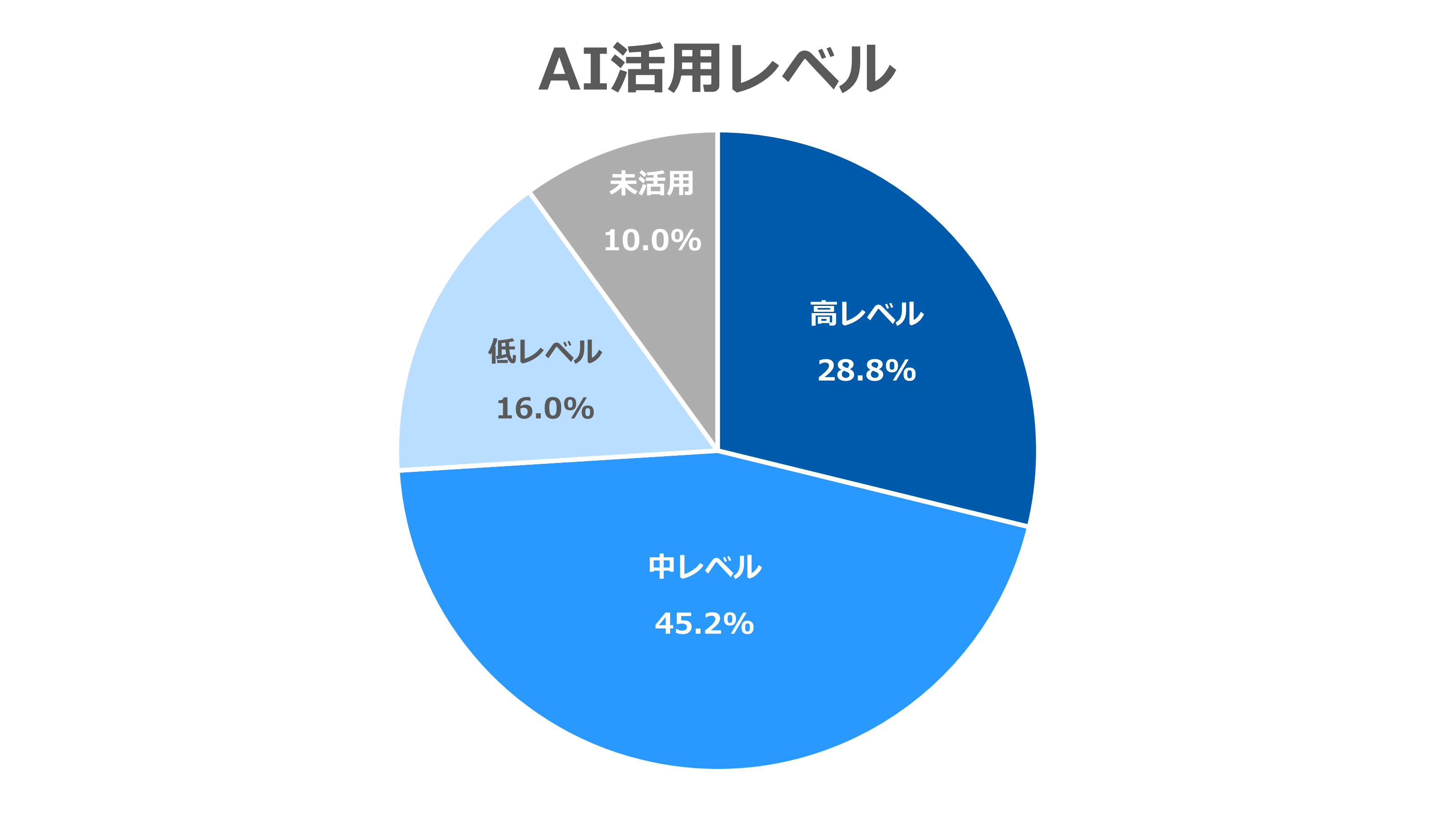・一方で、今回よりアンケートの回答結果から「利用頻度」「利用ツール数」「削減時間」「リテラシー」といった複数の観点で、業務活用しているパートナーを3段階の活用レベルに分類したところ、高レベルに分類されたパートナーは全体の28.8%にとどまる結果となりました。