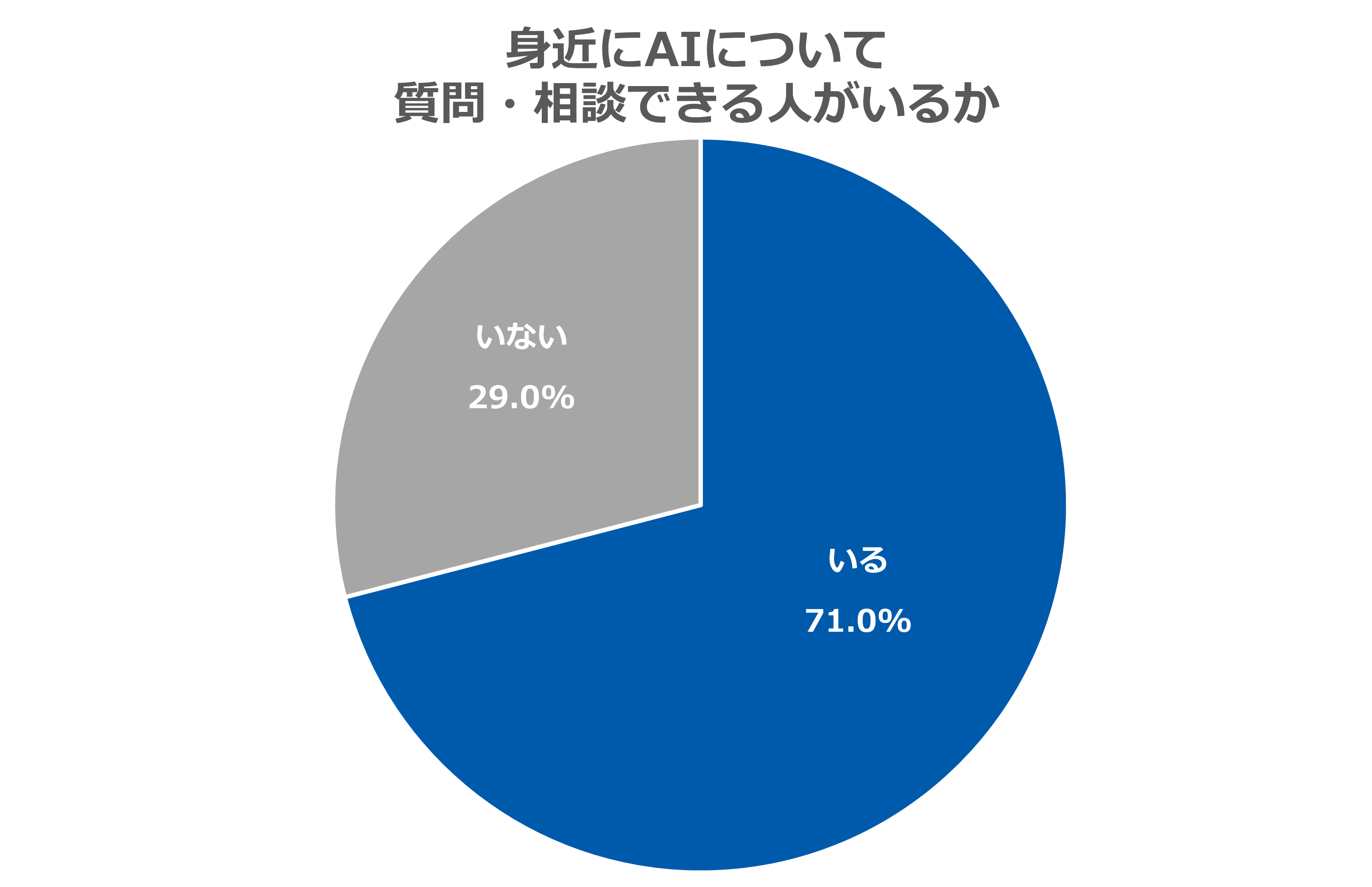 ・「身近にAIについて質問、相談できる人がいるか」という質問に対しては、「いる」と回答した人が71.0%で、周囲の仲間と相談しあってAI活用を推進できる環境が整ってきていることもわかりました。